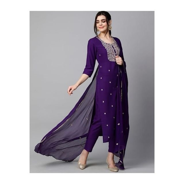 GoSriKi Women’s Cotton Blend Embroidered Kurta Set with Pant & Dupatta