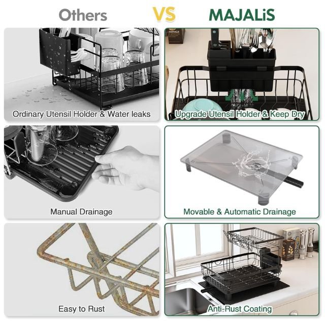 MAJALiS Dish Drying Rack, 2 Tier Dish Drainer Rack with Drip Tray and Drainer Mat